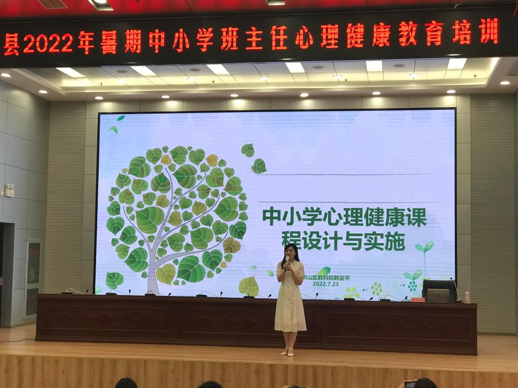 武汉市洪山区教育局教科院韩亚平老师以《中小学心理健康教育课程建设与设计》为题,围绕心理健康教育课程的特点、主题选择、教学内容设计,心理辅导活动课评价这几个方面展开报告。